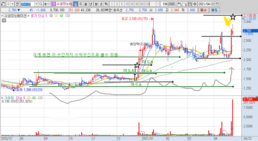 저는 우선 차트를 봅니다. 차트를 보는 이유 중에 가장 큰 이유는 현재의 주가 위치가 큰 흐름상 어디에 와 있는지를 확인하기 위함입니다. 그리고 스윙투자를 하기 위해서 좀 더 세세하게 움직임을 관찰하기도 합니다. 여기서 스윙투자는 주식 매수후2~3일 혹은 일주일 정도를 이야기 합니다. 세세하게 관찰한다는 의미는 일봉을 좀더 작게 쪼개 분봉으로 들여다 본다는 것입니다. 그럼 투자 방법을 이야기 하기 위해 차트를 하나 가져 오겠습니다.(차트는 아래로 쭉 스크롤 하면 보실수 있음)